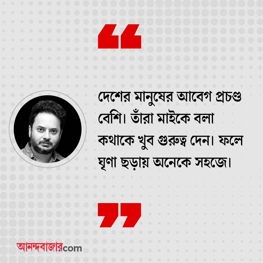 রাহুল: এই দেশের মানুষের আবেগ প্রচণ্ড বেশি। তাঁরা মাইকে বলা কথাকে খুব গুরুত্ব দেন। ফলে ঘৃণা ছড়ায় অনেক সহজে। সে কারণে এই বিষয়ে দায়িত্ববান হওয়া উচিত।