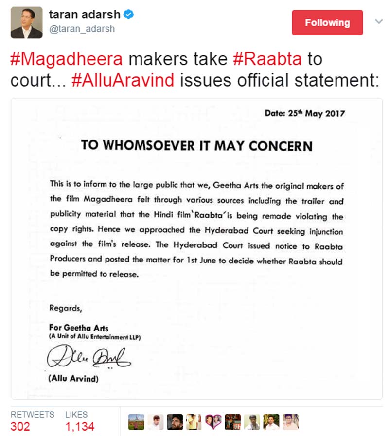 কিন্তু আইনি জটিলতার ফলে এখন বেশ অস্বস্তিতেই পড়েছে ‘রাবতা’র গোটা ইউনিট। কারণ, ‘গল্প চুরি’ এবং ‘কপিরাইট আইন লঙ্ঘন’ করার অভিযোগে হায়দরাবাদ আদালতে মামলা করেছেন ‘মগধীরা’র নির্মাতারা। আগামী ১ জুন এই মামলায় রায় ঘোষণার কথা। ওই দিনই জানা যাবে ৯ জুন ‘রাবতা’ আদৌ মুক্তি পাবে কিনা!