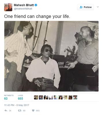 অভিনেতা বিনোদ খন্নার সঙ্গে খাস সম্পর্ক ছিল পরিচালক মহেশ ভট্টের। দু’বন্ধু মিলে একসঙ্গে বহু ভাল সময় কাটিয়েছেন। তাই স্মৃতির পাতা থেকে ছবি খুঁজে পেয়ে সকলকে দেখানোর লোভ সামলাতে পারলেন না মহেশ ভট্ট। সঙ্গে সঙ্গে শেয়ার করলেন টুইটারে। মনোক্রোম মোডের ছবিটিতে বিনোদ খন্না, মহেশ ভট্ট ছাড়াও রয়েছেন অনুপম খের। ছবির ক্যাপশনে মহেশ লিখেছেন, ‘একটাই বন্ধু জীবন বদলে দিতে পারে’।