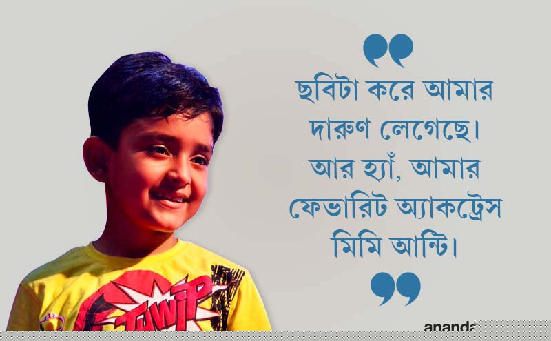 আড্ডার মুডে রিল মায়ের কোল ঘেঁষে বসে ‘পোস্ত’ অর্থাত্ অর্ঘ্য বসু রায়। নতুন মা কেমন? বকে নাকি? ফোকলা হেসে অর্ঘ্য বলল, ‘‘মা একটুও বকে না, খুব ভালবাসে।’’ পাশ থেকে মিমির সংযোজন, ‘একটু বেশি করে বলো। ছবিটা নিয়ে বলো।’ বাধ্য ছেলে জবাব দিল, ‘‘ছবিটা করে আমার দারুণ লেগেছে। আর হ্যাঁ, আমার ফেভারিট অ্যাকট্রেস মিমি আন্টি।’’ তাই নাকি? মিমির আর কোনও সিনেমা দেখেছো? ‘‘না তো। কোনও সিনেমা দেখিনি। তবে সিনেমার গান শুনেছি।’’