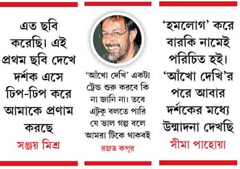 ৬০-৭০’য়ের দশকে সত্যজিৎ রায় আর মৃণাল সেনের বেশ কিছু ছবিতে অভিনয় করেছেন ধৃতিমান চট্টোপাধ্যায়। ‘প্রতিদ্বন্দ্বী’, ‘আকালের সন্ধানে’ আর ‘পদাতিক’য়ের অভিনেতা বলছেন, “এটা বলব না যে এই ধরনের ছবি এখানে একেবারেই দেখতে পাচ্ছি না। তবে বলব শতাংশের হিসেবে সংখ্যাটা কম। আমার তো মনে হয় সেটা অন্য ইন্ডাস্ট্রিতেও যে খুব বেশি, তা নয়। দর্শকেরও একটা বিরাট ভূমিকা রয়েছে এখানে। ‘আঁখো দেখি’র মতো ছবি যদি লোকে হলে গিয়ে না দেখে, তা হলে কী করে চলবে?”