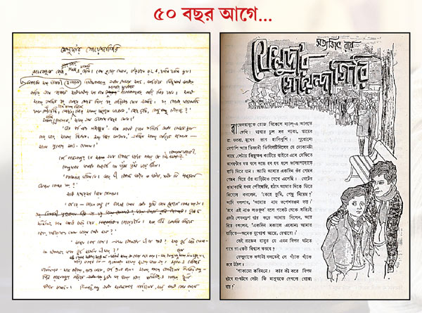 সত্যজিৎ রায়ের ম্যানুস্ক্রিপ্ট (বাঁ দিকে), সন্দেশ-এ প্রথম প্রকাশিত সেই গল্প(ডান দিকে)