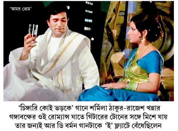 রূপঙ্কর: স্কেল কী হবে? কথাটা সম্পূর্ণ ভুল। মহিলা মানেই নিচু স্কেলে গাইবেন আর পুরুষ হলে উঁচু স্কেলে, এই ধারণাও ঠিক নয়। ধরা যাক ‘চিঙ্গারি কোই ভড়কে’ গানটা—শুরুতেই একটা গিটারের অংশ আছে। রাহুল দেব বর্মন এ গান কিশোরকুমারকে