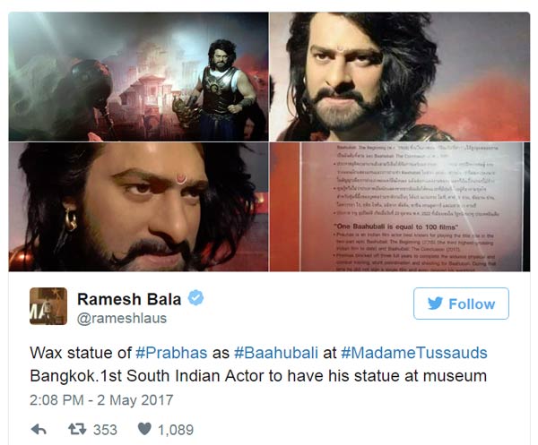 সোশ্যাল মিডিয়ায় প্রথম খবরটি শেয়ার করেন ফিল্ম সমালোচক রমেশ বালা। প্রভাসের মোমের মূর্তির ছবিও সঙ্গে দিয়ে দেন রমেশ। আর তারপর থেকেই সোশ্যাল মিডিয়া মশগুল রমেশের পোস্টটি নিয়ে। মুকুটে নতুন পালক যোগ হওয়ায় উত্ফুল্ল প্রভাস বলেন, “আমি খুব খুশি যে, মাদাম তুসোর মিউজিয়ামে স্থান পেয়েছি। এটার জন্য আমি দর্শকদের ধন্যবাদ জানাতে চাই। ভক্তদের ভালবাসাতেই এটা সম্ভব হল। আর আমার গুরু, এস এস রাজামৌলিকেও অসংখ্য ধন্যবাদ। তিনি যে আমার প্রতি আস্থা রেখেছেন, তার জন্য আমি কৃতজ্ঞ।”