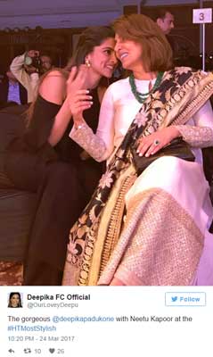 তবে এই ছবি নিয়ে রণবীর-দীপিকার ভক্তদের অতোটাও খুশি হওয়ার কিছু নেই। সম্প্রতি মুম্বইতে একটি পুরস্কার বিতরণী অনুষ্ঠানের ছবি এটি। যেখানে হাজির হয়ে গিয়েছিলেন দীপিকা পাড়ুকোন ও নীতু কপূর। রনবীর আর দীপিকা দুজনেই বেশ ভাল বন্ধু এখন। তাই প্রিয় বন্ধুর মায়ের সঙ্গে অনেকদিন পর দেখায় খোলা মনে আড্ডায় মেতেছিলেন ‘পিকু’। তিনি নিজেই নীতু কপূরের সঙ্গে ছবিটি টুইটারে শেয়ার করেছেন।