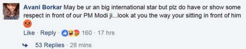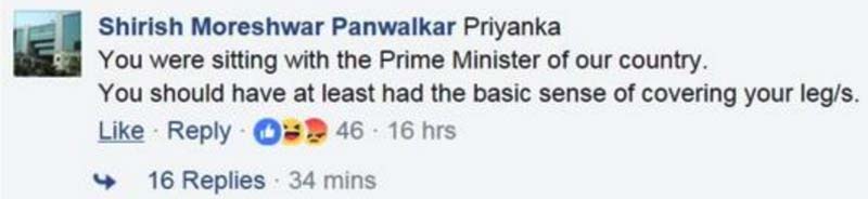 মঙ্গলবার বার্লিনে প্রধানমন্ত্রী নরেন্দ্র মোদীর সঙ্গে সাক্ষাতের পর নিজের ইনস্টাগ্রাম অ্যাকাউন্টে দু’টি ছবি পোস্ট করেছিলেন অভিনেত্রী যার একটি নিয়ে কড়া সমালোচনার মুখে পড়তে হয়েছিল তাঁকে। প্রধানমন্ত্রীর সামনে ছোট পোশাকে অভিনেত্রীর পায়ের উপর পা তুলে বসার ভঙ্গিকে ‘অসম্মান প্রদর্শন’ বলে ব্যাখ্যা করেন বেশ কিছু ফেসবুক ইউজার। একজন ইউজার শিরীষ পানওয়ালকর মন্তব্য করেছেন, “প্রিয়ঙ্কা আপনি দেশের প্রধানমন্ত্রীর সঙ্গে বসে আছেন। এই বোধটুকু থাকা উচিত, তাঁর সামনে আপনার পা ঢেকে বসা উচিত।” অন্য এক ইউজার অবনী বরকার লেখেন, “হতে পারে আপনি একজন আন্তর্জাতিক তারকা কিন্তু মোদীজিকে আপনার সম্মান করা উচিত। দেখুন কী ভাবে আপনি তাঁর সামনে বসে আছেন!” এমনই অসংখ্য সমালোচনায় ভরে যায় প্রিয়ঙ্কার সোশ্যাল অ্যাকাউন্ট। প্রিয়ঙ্কার পোস্ট করা দু’টি ছবিতেই গম্ভীর মুখে দেখা গিয়েছে প্রধানমন্ত্রীকে। তাহলে কি নরেন্দ্র মোদীও প্রিয়ঙ্কার ছোট পোশাকের জন্যই অস্বস্তিতে পড়েছিলেন! সে উত্তর অবশ্য জানা যায়নি। হয়তো কখনও জানা যাবেও না।