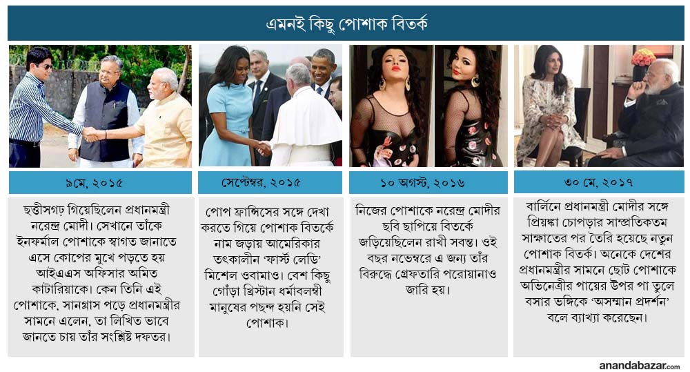 এরও আগে প্রধানমন্ত্রীর সঙ্গে দেখা করতে গিয়ে পোশাক বিতর্কে নাম জড়িয়েছিল এক আইএএস অফিসারের। ৯ মে, ২০১৫-এ ছত্তীসগঢ় গিয়েছিলেন নরেন্দ্র মোদী। সেখানে তাঁকে ইনফর্মাল পোশাকে স্বাগত জানাতে এসে কোপের মুখে পড়তে হয় আইএএস অফিসার অমিত কাটারিয়াকে। কেন তিনি এই পোশাকে, সানগ্লাস পড়ে প্রধানমন্ত্রীর সামনে এলেন, তা লিখিতভাবে জানতে চায় তাঁর সংশ্লিষ্ট দফতর। সোশ্যাল মিডিয়ায় এই বিষয়টি নিয়েও ব্যাপক সমালোচনার ঝড় ওঠে সে সময়।