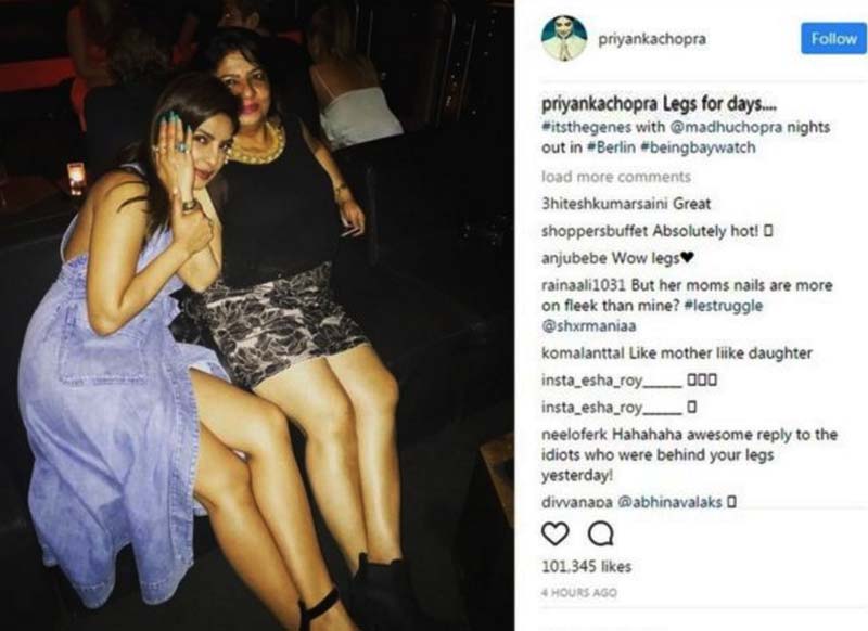 তবে প্রধানমন্ত্রী মোদীর সঙ্গে তাঁর সাম্প্রতিকতম সাক্ষাতের পর তৈরি হওয়া পোশাক বিতর্কের ক্ষেত্রে অবশ্য বেশ সুকৌশলে তার জবাব দিয়েছেন প্রয়ঙ্কা চোপড়া। এই সব সমালোচনার জবাবে প্রিয়ঙ্কা আর একটি ছবি পোস্ট করেন। এই ছবিতে প্রিয়ঙ্কা তাঁর মায়ের সঙ্গে বসে আছেন। দু’জনেরই পোশাক ছোট, এবং দু’জনেরই অনাবৃত পা ছবিতে স্পষ্ট ভাবে দৃশ্যমান। ছবির ক্যাপশনে অভিনেত্রী লিখেছেন, ‘লেগ্স ফর দ্যা ডে’। আর এই ছবিটি পোস্ট করার ঘণ্টা চারেকের মধ্যে এক লক্ষেরও বেশি লাইক পড়েছে। এ বার প্রিয়ঙ্কা নিশ্চই খুব খুশি! কারণ, প্রথম ছবিটির বিরুদ্ধে বিতর্কিত মন্তব্যের মোট সংখ্যার তুলনায় জবাবি ছবির লাইকের সংখ্যা অনেক গুণ বেশি।