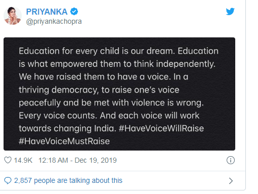 সংশোধিত নাগরিকত্ব আইন নিয়ে দেশ জুড়ে প্রতিবাদ বিক্ষোভের মধ্যেই মুখ খুললেন প্রিয়ঙ্কা চোপড়া। বলিউডের আরও বেশ কিছু তারকাদের মতো তিনিও জামিয়া মিলিয়া ইসলামিয়া এবং আলিগড় মুসলিম বিশ্ববিদ্যালয়ের ছাত্রছাত্রীদের উপর পুলিশের হিংসাত্মক পদক্ষেপের বিরুদ্ধে প্রতিবাদে সামিল হলেন। টুইটে তিনি লিখলেন, ‘‘প্রত্যেক শিশুর জন্য শিক্ষা আমাদের স্বপ্ন। শিক্ষাই তাদের স্বাধীন ভাবে চিন্তা করতে শেখায়। আমরা তাদের বড় করেছি যাতে একটি প্রতিবাদী কণ্ঠ পাই।’’