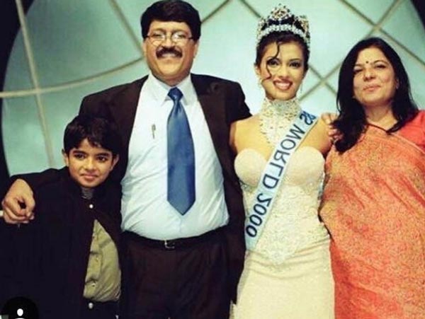 ২০০০ সালে ‘মিস ওয়ার্ল্ড’-এর ক্রাউন পড়ে প্রিয়ঙ্কা। সঙ্গে বাবা, মা ও ভাই। ছবি: প্রিয়ঙ্কার ইনস্টাগ্রাম পেজের সৌজন্যে।