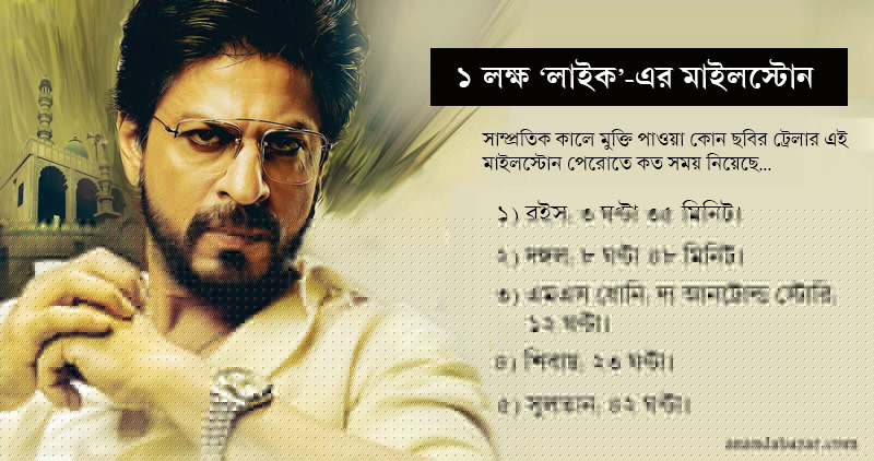 তা বুধবার কী এমন প্রমাণ পেলেন বলিউডের বাজার বিশেষজ্ঞরা যাতে তাঁদের মনে হচ্ছে বক্স অফিস দখলের লড়াইয়ে ‘রইস’-এর পাল্লা বেশ ভারি? বক্স অফিস সমীক্ষকদের মতে, ছবির ট্রেলার মুক্তির মাত্র ৩ ঘণ্টা ৩৫ মিনিটের মধ্যেই ১ লক্ষ ‘লাইক’ পড়েছে ‘রইস’-এর খাতায়। এতে এমন চমকানোর কী আছে!