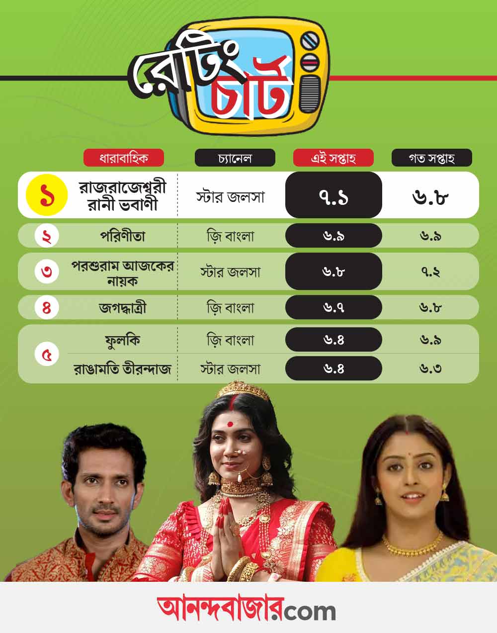 দর্শকের মন অবশ্য সেই বিতর্কে আবদ্ধ নয়। বরং ‘রাজরাজেশ্বরী রানী ভবাণী’তেই মন দিয়েছেন তাঁরা। অভিনেত্রী রাজনন্দিনীর ধারাবাহিকটিই এ সপ্তাহে ‘বেঙ্গল টপার’। গত সপ্তাহে তৃতীয় স্থানে ছিল এই ধারাবাহিক। এ বার এই কাহিনি পয়লা নম্বরে। তাদের প্রাপ্ত নম্বর ৭.১। জীতু-দিতিপ্রিয়ার ধারাবাহিকটি রয়েছে সপ্তম স্থানে। তাদের প্রাপ্ত নম্বর ৫.৭।