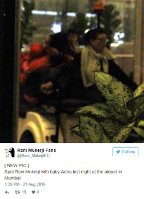কিন্তু, আদিরাকে এখনও কেউ দেখেননি। এ বার মুম্বই বিমানবন্দরে আদিরার সঙ্গে রানিকে ক্যামেরাবন্দি করলেন পাপারাত্জিরা। সেই ছবি টুইটারে ‘রানি মুখার্জি ফ্যানস’-এর তরফ থেকে শেয়ার করা হয়েছে। আর সেটাই এখন ওয়েব দুনিয়ায় ভাইরাল।