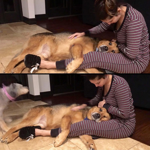 সানি লিখেছেন, ‘ঠিক এ ভাবেই আমার সকাল শুরু হয়। মেঝের ওপর আমি পা ছড়িয়ে বসি। আর আমার ছেলে চপার এসে আমার কোলে শুয়ে পড়ে। ওকে আমি খুব ভালবাসি।’