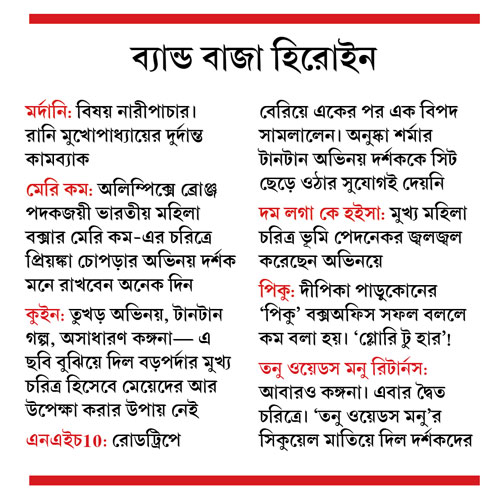 এনএইচ-১০-এর কথাই যদি ধরি। নায়িকা অনুষ্কা শর্মা গাড়ি চালাতে চালাতে ভিলেনকে পিষে মেরে দিচ্ছেন, ভিলেনদের সঙ্গে পাল্লা দিয়ে গাড়ি ছোটাচ্ছেন, ক্ষতবিক্ষত ও ক্লান্ত শরীরে রোয়াকে বসে সিগারেট ধরাচ্ছেন— বলিউডি সুপারস্টার কালচারে এ দৃশ্য বিরল। বোঝাই যাচ্ছে বাথটাব-স্নান, বরফে শিফন শাড়ির লাস্য একঘেয়ে হয়ে গিয়েছে দর্শকের কাছে। তা হলে একের পর এক মহিলাকেন্দ্রিক ছবির সাফল্যের কারণটা ঠিক কী?