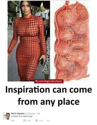 রবিবার লাল ড্রেস পরা কিমের একটি ছবি টুইট করেছেন ঋষি। সঙ্গে কোলাজে রয়েছে এক বস্তা পেঁয়াজ। ছবির নীচে লেখা রয়েছে ‘অনুপ্রেরণা যে কোনও জায়গা থেকে আসতে পারে।’ আর ঋষি নিজে ক্যাপশনে লিখেছেন, ‘ঠিক যেন বস্তা ভর্তি পেঁয়াজ।’