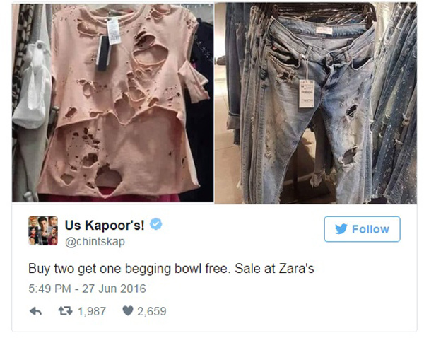 তাতে নাকি বেজায় চটেছিলেন ঋষি কপূর। আর সেই ছেঁড়া জামা-কাপড়ের ছবিই টুইটারে পোস্ট করে দিয়েছেন ঋষি। সঙ্গে ক্যাপশন লিখে দিয়েছেন- ‘দুটো কিনুন আর একটা ভিক্ষাপাত্র ফ্রি’তে পান। ‘জারা’য় সেল চলছে।’