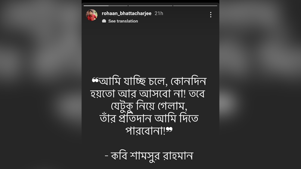 রবিবার অভিনেত্রী পল্লবী দে-র ঝুলন্ত দেহ উদ্ধার। সোমবার সন্ধেয় রোহন ভট্টাচার্যের ইনস্টাগ্রাম স্টোরিতে জ্বলজ্বল করছে কবি শামসুর রহমানের উদ্ধৃতি। ভাগ করে নেওয়া পংক্তি অনুযায়ী, ‘আমি যাচ্ছি চলে। হয়তো কোনও দিন আর আসব না। তবে যেটুকু নিয়ে গেলাম তার প্রতিদান আমি দিতে পারব না।’ স্টোরি দেখেই নড়ে বসেছে টলিউড। চমকে গিয়েছেন অভিনেতার অনুরাগীরাও। সদ্য প্রেম ভেঙেছে রোহন ভট্টাচার্য-সৃজলা গুহর। তবে কি রোহনও....?