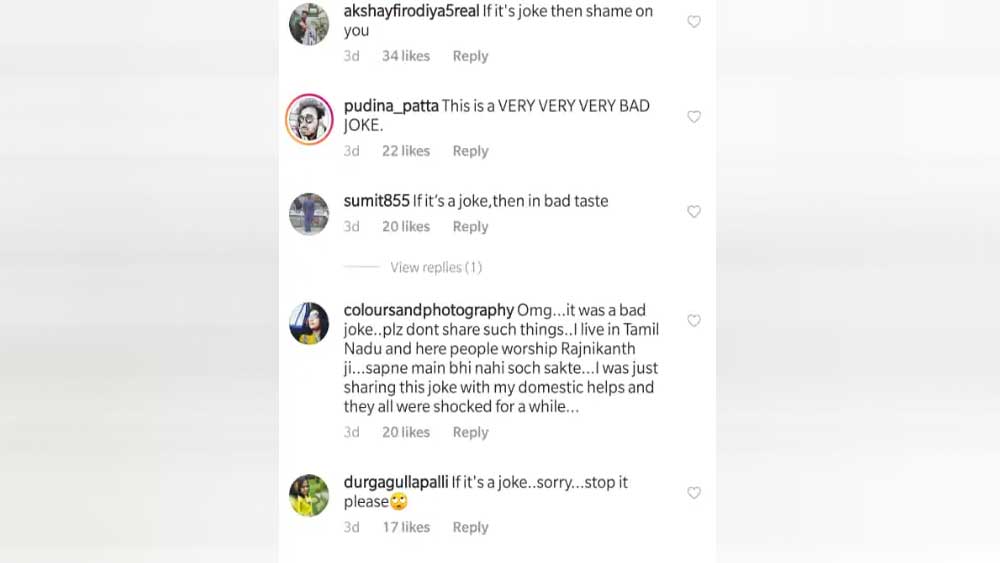 আর একজন লেখেন, “কী আবোল তাবোল বলছেন? উনি একদম সুস্থ আছেন।” ফ্যানেদের রাগ দেখে কমেন্ট বক্সেই রোহিত লেখেন, “শান্ত হন। মজা মজাই হয়। এটা টিপিক্যাল ‘রজনি জোক’ ছাড়া আর কিছুই নয়। কেন আমি এই পোস্টটা করেছি, কী উদ্দেশ্য ছিল আমার সেটা দেখুন। আমাকে এ ভাবে অপমান করা বন্ধ করুন।”