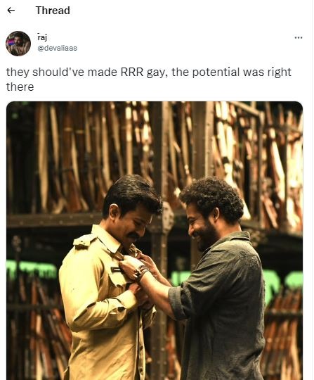 I was right 😎 “They are so gay' Western audience's perception of 'RRR' as a gay story https://t.co/OxVDVr5Qsp