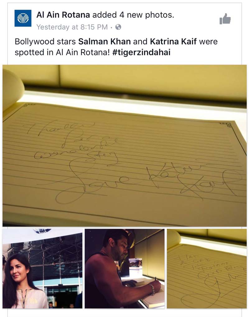 হ্যাঁ, এক সঙ্গেই রয়েছেন সলমন-ক্যাটরিনা। দু’জনেই কিছু ক্ষণ সময় কাটিয়েছেন দুবাইয়ের আল আইন রোটানা হোটেলে। এই হোটেলের অফিসিয়াল সোশ্যাল পেজে সোমবার রাতে চারটি ছবি পোস্ট করেন আল আইন রোটানা কর্তৃপক্ষ। ছবিগুলি থেকে এটা স্পষ্ট, ‘টাইগার জিন্দা হ্যায়’ ছবির শুটিংয়ে এখন ওই হোটেলে উঠেছেন সলমন-ক্যাটরিনা-সহ শুটিং ইউনিটের অনেকেই। হোটেলের অটোগ্রাফের ডায়রিতে ‘টাইগার জিন্দা হ্যায়’র উল্লেখ করে সলমন-ক্যাটরিনার সইও ধরা পড়েছে এই ছবিতে।