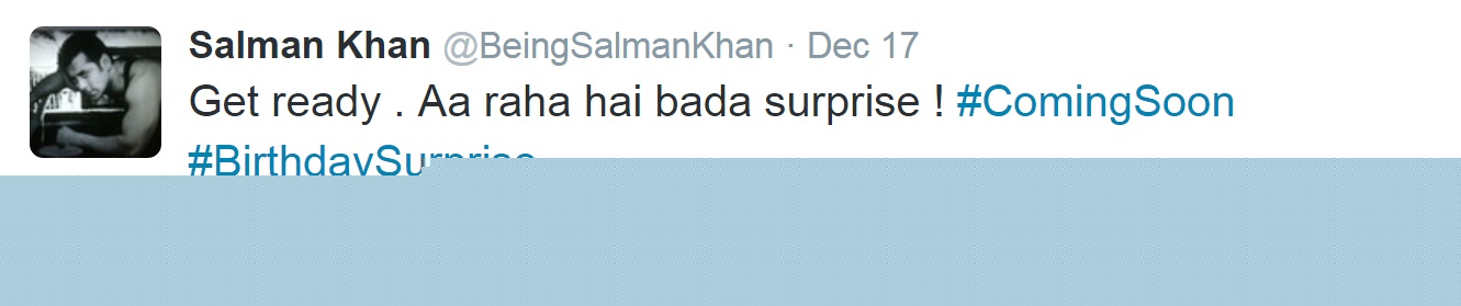 সলমন তাঁর টুইটার অ্যাকাউন্টে লিখেছেন, ‘‘তৈরি থাকুন। আসছে বড় সারপ্রাইজ! শীঘ্রই আসছে। জন্মদিনের চমক।’’