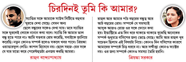 তা হলে প্রিয়ঙ্কা সোনারপুরে ফ্ল্যাট কিনে থাকতে আরম্ভ করল কেন? সে প্রশ্নের উত্তর না দিয়ে উল্টে প্রশ্ন করলেন, ‘‘প্রিয়ঙ্কা কি সোজাসুজি কখনও বলেছে ওদের সম্পর্কে চিড় ধরার জন্য আমি দায়ী? ওর সঙ্গেও আমার সম্পর্ক ভাল। আর ও আমার খুব পছন্দের অভিনেত্রী।’’