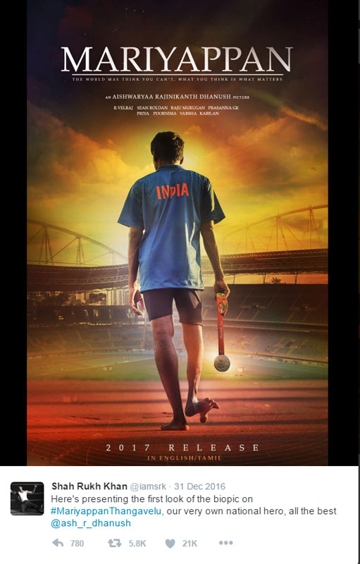 এই সিনেমারই ফার্স্ট লুক মুক্তি পেল টুইটারে। আর সেই পোস্টটি করলেন কিঙ্গ খান। এবং ঐশ্বর্যা রজনীকান্তের ‘মারিয়াপ্পান-এর জন্য শুভ কামনাও জানালেন। ইংরেজি ও তামিল এই দুই ভাষাতেই মুক্তি পাবে ‘মারিয়াপ্পান’।