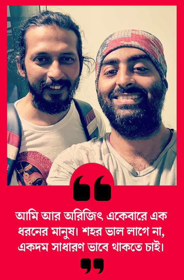 অর্ণব: একটা কাজের কথা বলতে গিয়েছিলাম। ওকে ঠিক আমার মতো মনে হয়। একদম সাধারণ ভাবে থাকতে ভালবাসে। খুব ভাল ছেলে। মুর্শিদ নিয়ে গিয়েছিল আমাকে ওর বাড়িতে। অরিজিৎ জিয়াগঞ্জে যে ভাবে থাকে, শান্তিনিকেতনে গেলে আমিও এ ভাবেই থাকি। আমি খুব লাজুক স্বভাবের মানুষ, ও চুপচাপ ধরনের। খুব প্রয়োজন না হলে কথা বলে না।