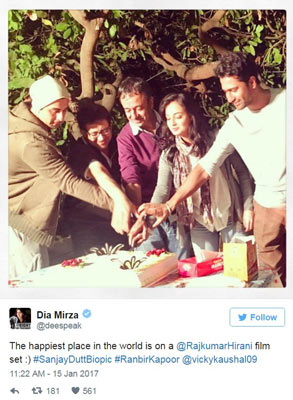 দিয়া মির্জা যে ছবি শেয়ার করেছেন তাতে অনেকেই রয়েছেন। রণবীর কপূর, চিত্রনাট্যকার অভিজাত জোশী, রাজকুমার হিরানি, দিয়া মির্জা এবং ভিকি কৌশল। তবে, প্রথম দিন একটু হাল্কা চালেই শুটিং শেষ হয়েছে। তা তো হওয়ারই কথা। কেন না দৃশ্যটাই একটি মজার। সে কথাও টুইটারে জানিয়েছেন পরিচালক।
