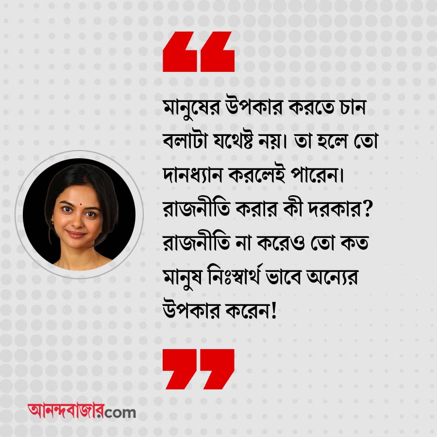 শোলাঙ্কি: যে কেউ ভোটে দাঁড়াতে পারেন, যে কেউ রাজনীতির ময়দানে নামতে পারেন। সেটা তাঁদের ব্যক্তিগত সিদ্ধান্ত। কিন্তু সকলেরই ন্যূনতম রাজনৈতিক জ্ঞান থাকা উচিত। নয়তো রাজনীতি ছেলেখেলায় পরিণত হয়ে যাবে। অথচ একটা দেশ দাঁড়িয়েই থাকে রাজনৈতিক সিদ্ধান্তের উপর। খুব গুরুত্বপূর্ণ এটা। সেটা বুঝে রাজনীতিতে যাওয়া উচিত।