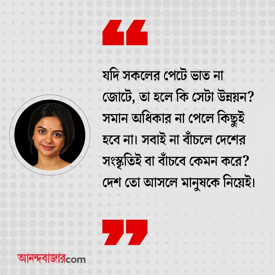 শোলাঙ্কি: যদি সকলের পেটে ভাত না জোটে, তা হলে কি সেটা উন্নয়ন? সমান অধিকার না পেলে কিছুই হবে না। সবাই না বাঁচলে দেশের সংস্কৃতিই বা বাঁচবে কেমন করে? দেশ তো আসলে মানুষকে নিয়েই। শুধু তো মানচিত্র নয়। দেশের সংজ্ঞাই পাল্টে দেওয়া হচ্ছে। এই ধরনের জাতীয়বাদের অর্থ কী, যেখানে মানুষেরই কোনও জায়গা নেই? কেউ বুঝিয়ে দিক আমাকে!