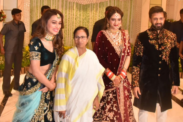 রিসেপশনে নুসরত ও নিখিলের সঙ্গে মুখ্যমন্ত্রী মমতা বন্দ্যোপাধ্যায় এবং মিমি চক্রবর্তী। নিজস্ব চিত্র