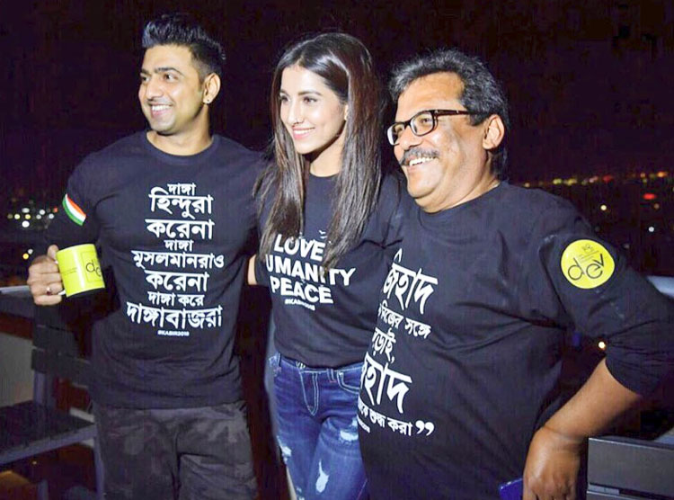 ‘কবীর’-এর প্রচারে দেব-রুক্মিণী এবং অনিকেত। ছবি: টুইটারের সৌজন্যে।