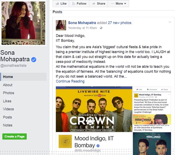 যদিও সোনার সব অভিযোগ অস্বীকার করেছে টিম মুড ইন্ডিগো। তাঁদের মিডিয়া ম্যানেজার কেতকী কাকাডের দাবি, ‘‘আমরা সোনা মহাপাত্রকে বার্ষিক অনুষ্ঠানে গান গাওয়ার জন্য অ্যাপ্রোচ করেছিলাম। কিন্তু উনি যে টাকা চেয়েছেন তা আমাদের বাজেটের বাইরে। উনি মহিলা আর্টিস্টের একক অনুষ্ঠান না করানো নিয়ে যে অভিযোগ করছেন তা সম্পূর্ণ মিথ্যে। কারণ আমরা তুলসী কুমারকে আমন্ত্রণ জানিয়েছি। এ বছর বিদ্যা ভক্স পারফর্ম করবেন শঙ্কর টুকারের সঙ্গে। আর ওঁর ‘সেক্সিস্ট’ কমেন্ট নিয়ে একটাই কথা বলতে পারি, এখানে কঠিন পরিশ্রম করলে তবেই পড়াশোনার সুযোগ পায় ছাত্রছাত্রীরা। ছেলেদের জন্য কোনও আলাদা করে আসন সংরক্ষণ করা হয় না।’’