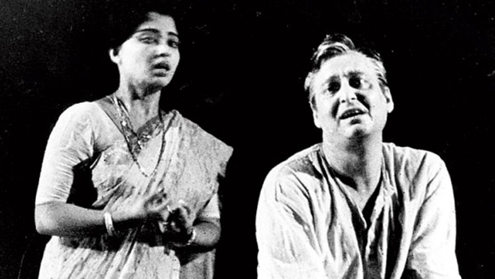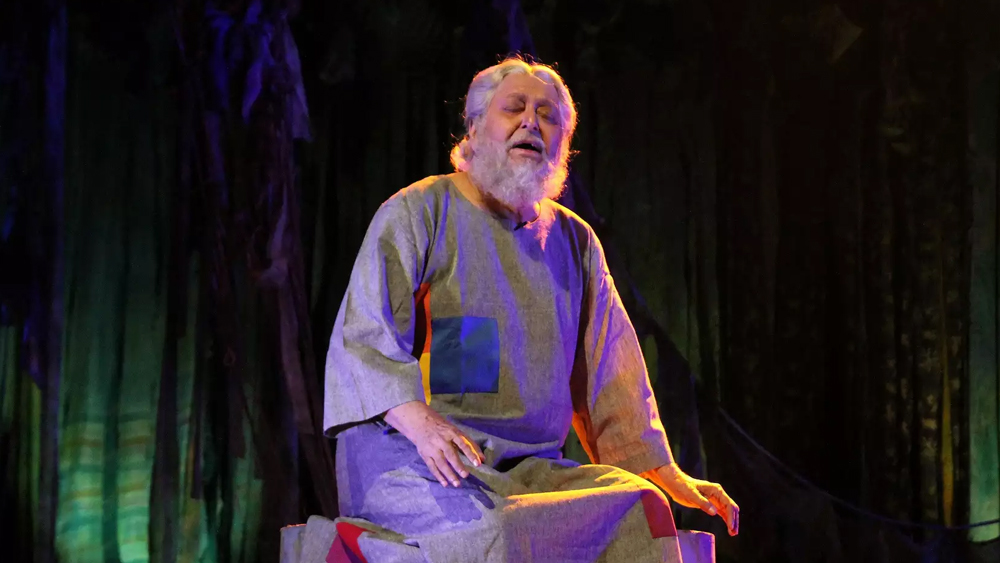 সৌমিত্রদা মেকআপ তুলছেন। এমন সময়ে একজন দর্শক সেখানে এলেন। হাউ হাউ করে কাঁদছেন আর বলে যাচ্ছেন— “আপনার মতো মানুষের সঙ্গে কী ভাবে ওরা এমনটা করল!” এতটাই বিশ্বস্ত সেই চরিত্রায়ন। নীলকণ্ঠ নাটকের দৃশ্য। ছবি: আনন্দবাজার আর্কাইভ থেকে।