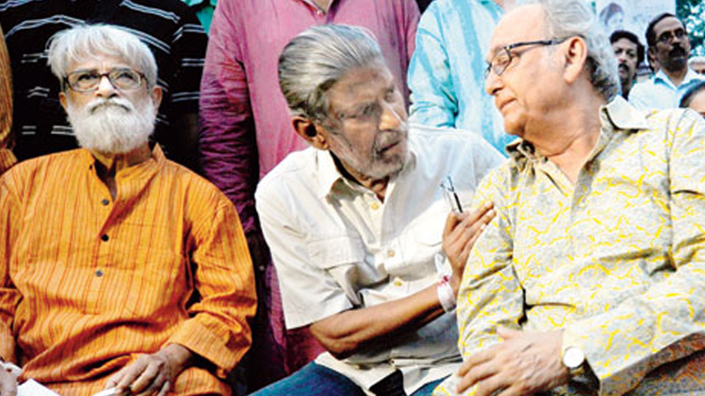 ঘনিষ্ঠ প্রতিবেশী হিসেবে দেখেছি, সারা জীবনে কখনও তিনি অস্বাভাবিকতার চর্চা করেননি। লেখক এবং রুদ্রপ্রসাদ সেনগুপ্তর সঙ্গে সৌমিত্র চট্টোপাধ্যায়। ফাইল চিত্র।