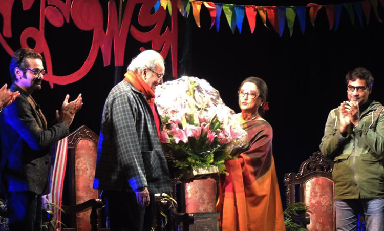 মঞ্চে সৌমিত্রকে বরণ করে নিচ্ছেন অপর্ণা সেন। পাশে রয়েছেন প্রসেনজিত্ চট্টোপাধ্যায় এবং কৌশিক সেন।