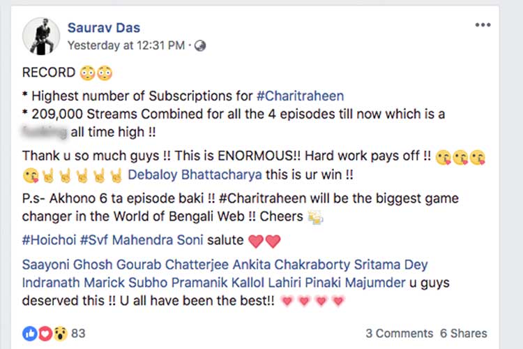 দিন তিনেক বয়স দেবালয় ভট্টাচার্যের ‘চরিত্রহীন’-এর। দেবালয়ের পরিচালনায় মাত্র তিন দিন আগে এই ওয়েব সিরিজের স্ট্রিমিং শুরু হয়েছে ‘হইচই’ প্ল্যাটফর্মে। আর এর মধ্যেই ছক্কা হাঁকিয়েছে গোটা টিম। অন্তত তেমনটাই দাবি করলেন ‘চরিত্রহীন’-এর অন্যতম অভিনেতা সৌরভ দাস।