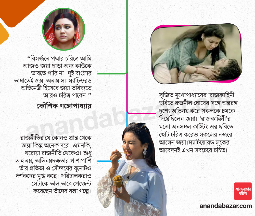 রাজনীতির যে কোনও প্রান্ত থেকে জয়া কিন্তু অনেক দূরে। এমনকি ঘরোয়া রাজনীতি থেকেও। শুধু তাই নয়, অভিনয় দক্ষতার পাশাপাশি তাঁর প্রতিভা ও সৌন্দর্যের বুনোটও দর্শকদের মুগ্ধ করে। পরিচালকরাও সেটাকে ভাল ভাবে প্রেজেন্ট করেছেন তাঁদের বলা গল্পে। একইসঙ্গে জয়াও নিজের শক্তিশালী ঘুঁটিগুলোকে সাজিয়ে নিচ্ছেন। এখানেই এগিয়ে গিয়েছেন তিনি।