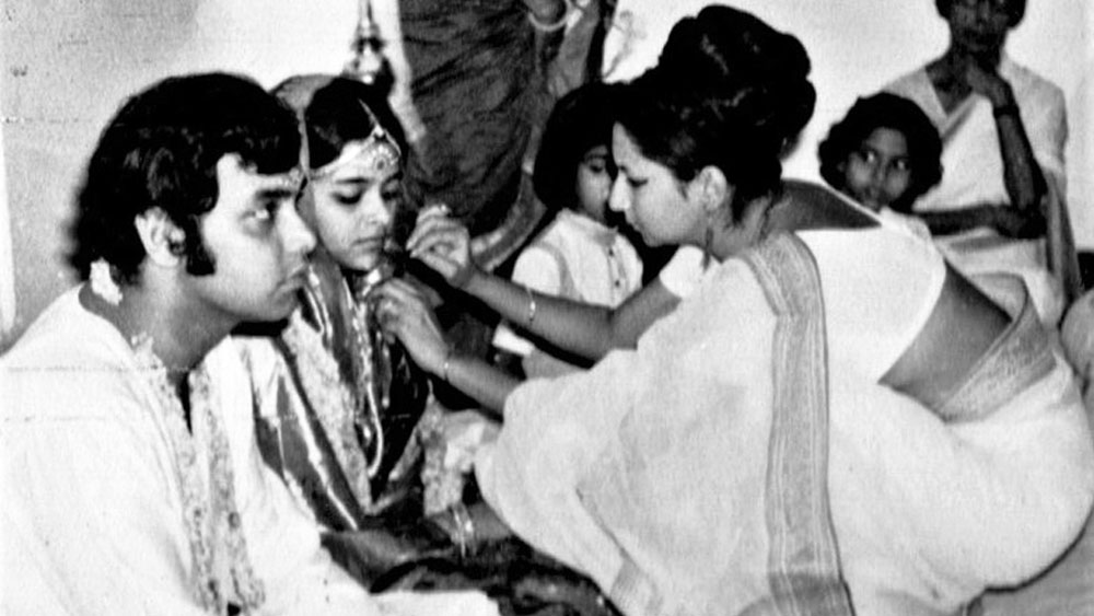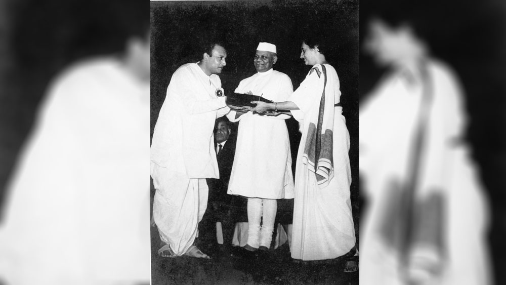 ইন্দিরা গাঁধীর হাত থেকে বিএফজেএ পুরস্কার গ্রহণ করছেন বসন্ত চৌধুরী