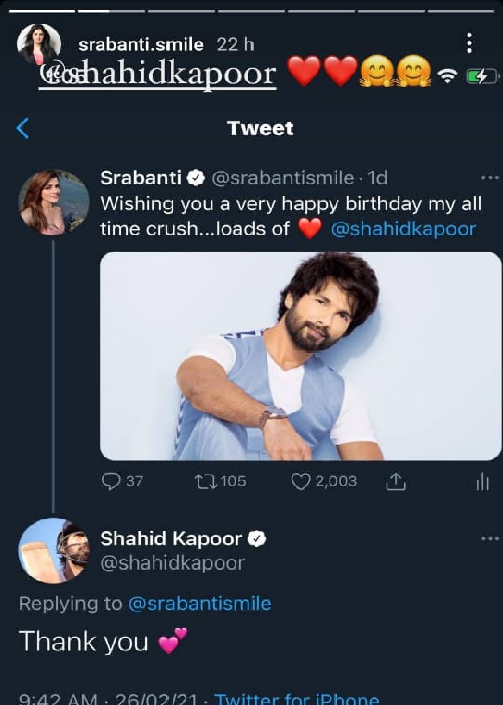 শ্রাবন্তীর শুভেচ্ছার উত্তর দিয়েছেন শাহিদ। নিজের ভেরিফায়েড অ্যাকাউন্ট থেকে লিখেছেন, ‘ধন্যবাদ’। তার সঙ্গেই জুড়ে দিয়েছেন একটি ভালবাসার ইমোজি।