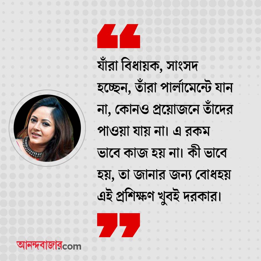 শ্রীলেখা: অবশ্যই পরীক্ষা হওয়া জরুরি! এটা একটা পেশা। রাজনীতিবিদেরা তাঁদের এই পেশা থেকে ভাল অঙ্কের টাকা রোজগার করছেন। আর যে কোনও কাজের জন্য প্রশিক্ষণ প্রয়োজন। এই যে যাঁরা বিধায়ক, সাংসদ হচ্ছেন, তাঁরা পার্লামেন্টে যান না, কোনও প্রয়োজনে তাঁদের পাওয়া যায় না। এ রকম ভাবে কাজ হয় না। কী ভাবে হয়, তা জানার জন্য বোধহয় এই প্রশিক্ষণ খুবই দরকার।