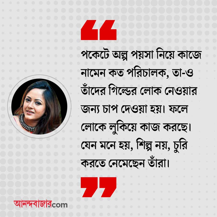 শ্রীলেখা: আমাদের ইন্ডাস্ট্রি একটা ছোট অংশ। আলাদা একটা ইউনিট হিসেবে কাজ করে। যদিও সেটিও এখন… যাই হোক! মোট কথা, ভোটের প্রচারে জায়গা পাওয়ার কোনও দরকার আছে বলে আমার মনে হয় না। তবে ফেডারেশন যে ভয়ে ও আতঙ্কে রেখেছে শিল্পীদের, সেটা মোটেই সমর্থন করতে পারি না। পকেটে অল্প পয়সা নিয়ে কাজে নামেন কত পরিচালক, তাও তাঁদের গিল্ডের লোক নেওয়ার জন্য চাপ দেওয়া হয়। ফলে লোকে লুকিয়ে কাজ করছে। যেন মনে হয়, শিল্প না, চুরি করতে নেমেছেন তাঁরা। মানুষের মেরুদণ্ডটাকে ভেঙে দেওয়া হচ্ছে। আতঙ্ককে ছড়িয়ে দেওয়া হচ্ছে। এটা কোনও ভাবে প্রচারে অংশ নিলে ভাল।