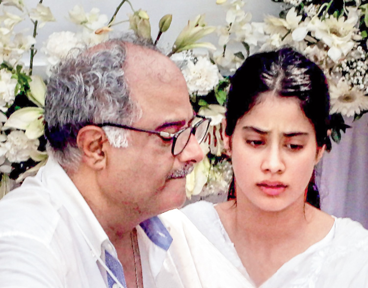 স্বজনহারা: মেয়ে জাহ্নবীকে নিয়ে শ্রীদেবীর শেষকৃত্যে বনি কপূর। বুধবার মুম্বইয়ে। ছবি: পিটিআই