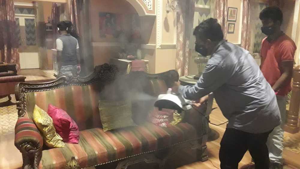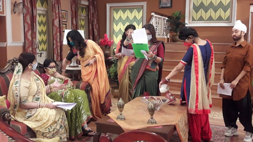 অন্য দিকে সেটের মধ্যেই আক্ষেপ ‘বড়মা’ বা ‘ঠাম্মি’ অনুরাধা রায়ের। তসরে জমাটি কাঁথা কাজের শাড়ি। গা মোড়া গয়না। অনুরাধার গ্ল্যামার যদিও বাড়িয়েছে ডিজাইনার মাস্ক! বলতেই ছোট্ট হাসি, ‘‘যা দিনকাল, এ ছাড়া উপায় নেই।’’ টেনশন হচ্ছিল শুটে আসতে? ‘‘একটু একটু’’, নির্দ্বিধায় স্বীকার। যখন দেখলেন প্রযোজক সংস্থা অ্যাক্রোপলিস স্যানিটাইজিংয়ে প্রচণ্ড কড়াকড়ি করছে তখন ভরসা পেয়ে আবার স্টুডিয়োয়।