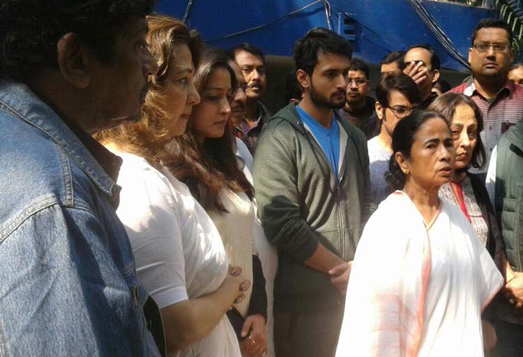 সুপ্রিয়া দেবীর বাড়িতে মমতা বন্দ্যোপাধ্যায়। সঙ্গে রয়েছেন প্রসেনজিত্, মুনমুন সেন, রাইমা সেন, গৌতম ঘোষ প্রমুখ।ছবি: শশাঙ্ক মণ্ডল।