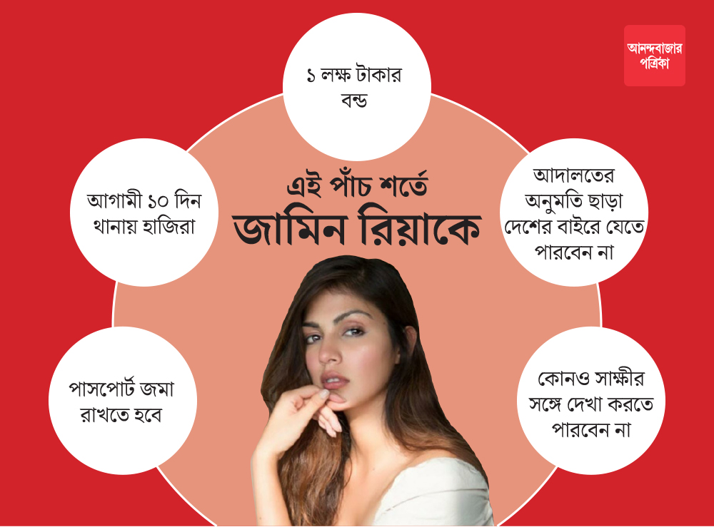 জেল থেকে বেরিয়ে আসার পর আগামী ১০ দিন নিকটবর্তী থানায় রিয়াকে হাজিরা দেওয়ার নির্দেশ দিয়েছে আদালত। জামিনের বন্ড বাবদ ১ লক্ষ টাকা জমা করতে বলা হয়েছে তাঁকে।