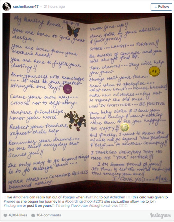 তিন বছর আগে মেয়ে রেনেকে চিঠিকে লিখেছিলেন মা সুস্মিতা। বোর্ডিং স্কুলের দিকে পা বাড়ানো ১৩ বছরের মেয়েকে ভালবাসা আর সুন্দর পরামর্শে ভরিয়ে দিয়েছিলেন সুস্মিতা। কিছু দিন আগে ষোড়শী মেয়ের স্কুলের বার্ষিক অনুষ্ঠানে সুস্মিতার বক্তৃতা শুনে মুগ্ধ হয়ে যান সকলে। তারপরই ইনস্টাগ্রাম সেই চিঠির ছবি পোস্ট করেন সুস্মিতা।