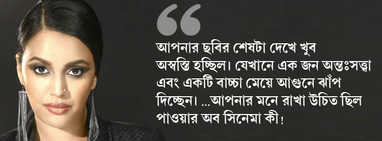 পরিচালককে তিনি মনে করিয়ে দিয়েছেন, ছবি মুক্তির পনেরো দিন আগেই হরিয়ানায় এক দলিত নাবালিকাকে গণধর্ষণের মতো ঘটনা দেখেছে এই দেশ। মনে করিয়েছেন দিল্লির নির্ভয়া কাণ্ডের কথাও। সিনেমার মতো শক্তিশালী গণমাধ্যমে নারীকে সেই ভ্যাজাইনা বা যোনি সর্বস্ব পণ্য হিসেবে দেখানোটা এক জন দায়িত্বশীল পরিচালকের কাজ নয়, বলেছেন স্বরা।